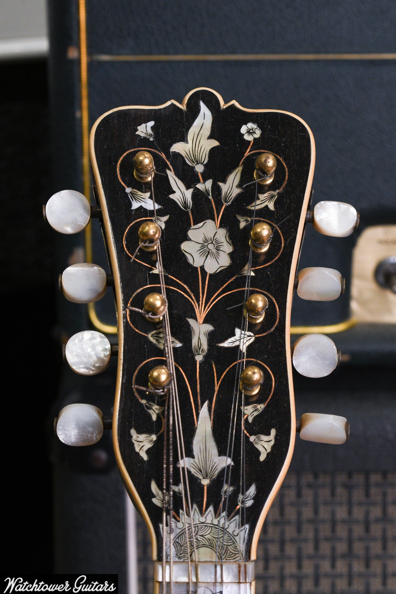 Adding to its elaborate decoration, the mandolin boasts a pearl fingerboard and a striking pearl butterfly inlay on the top, showcasing the artistic flair and attention to detail that make this instrument a true work of art. The mandolin is finished with gold-plated tuners, adorned with pearl buttons, adding to its overall elegance and functionality. The 1890s Cremonatone mandolin is not only a beautiful instrument but also a testament to the rich heritage of Washburn's craftsmanship, making it a prized possession for collectors and musicians alike.