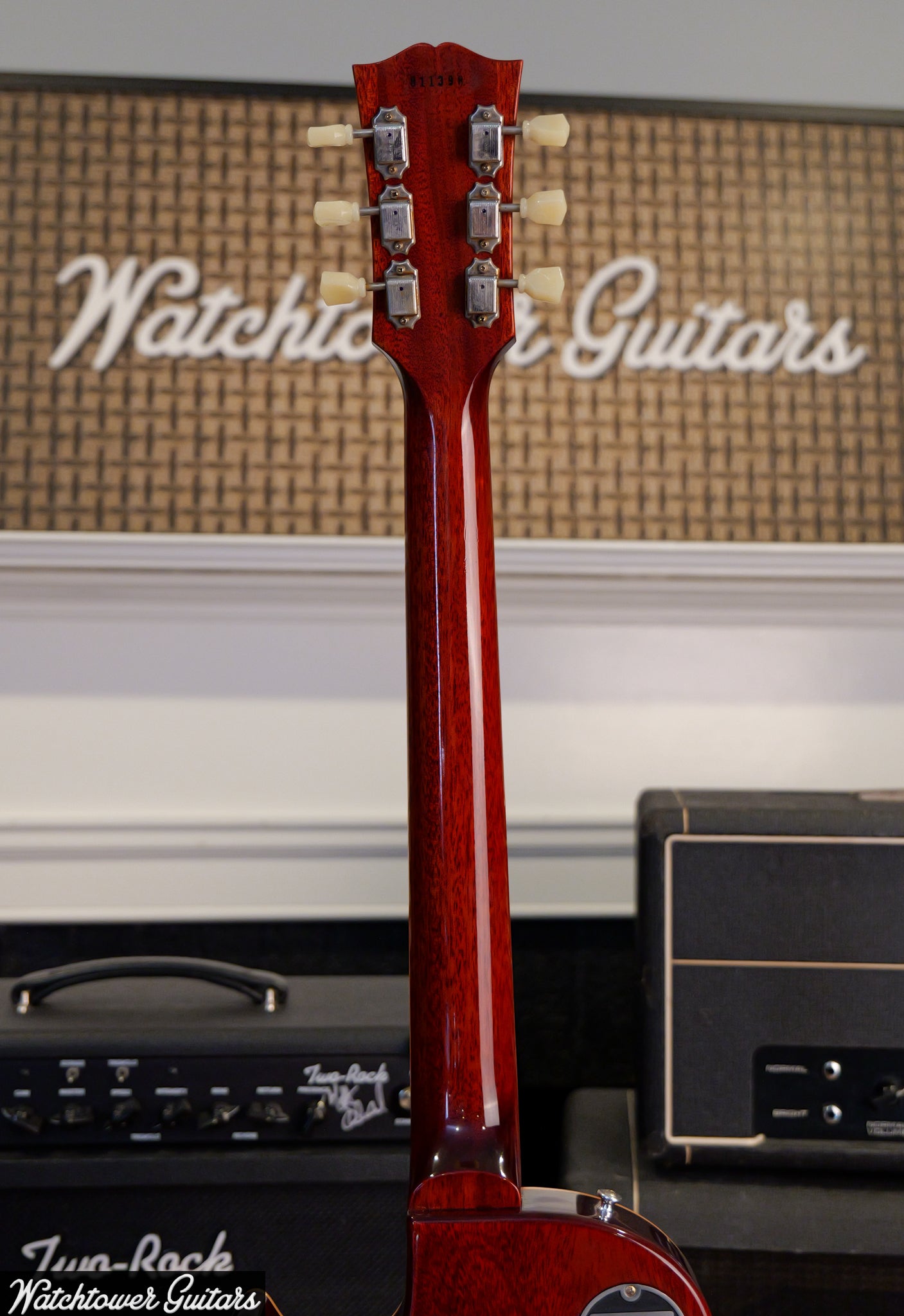 This 2021 Gibson Custom Shop R8 '58 Les Paul Standard Reissue is a lightly played example that delivers the full, chunky neck feel and voiced tone associated with late‑’50s Gibson single‑cutters. It uses historic construction methods replicated by Gibson Custom with period‑correct appointments: a plain maple top over a mahogany body, a round chunky neck profile with narrow frets, and Handwound PAF‑style humbuckers that emphasize warm midrange, touch sensitivity, and sustaining power. The guitar is well balanced and resonates like a true late‑1950s instrument while remaining comfortable to play; it’s listed at 8 lbs 1 oz and ships in its Lifton‑style hard case with all original paperwork and Certificate of Authenticity.