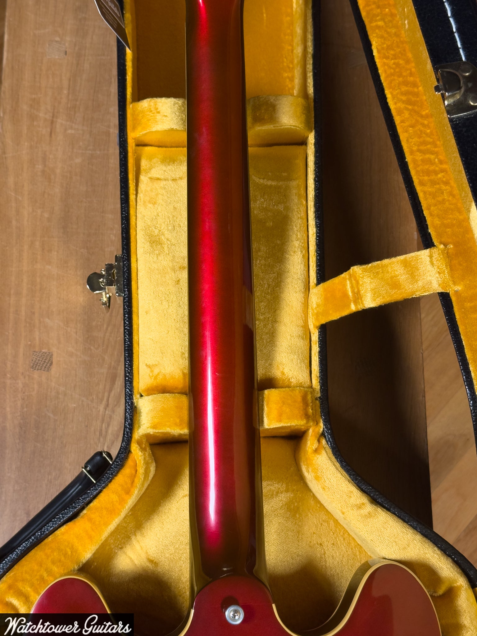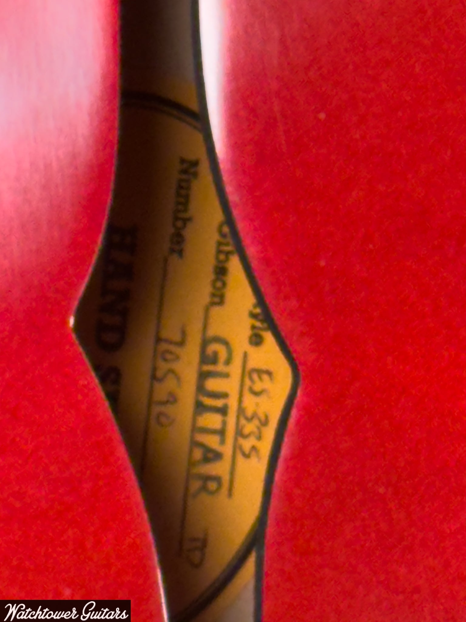 This ES-335 was constructed with a laminated maple body and a mahogany neck with a rosewood fingerboard. The neck measures 1 11/16” at the nut, has a depth of 0.81” at the first fret, and a depth of 1.00” at the twelfth fret. The guitar has a 24 3/4” scale and weighs 7lb 12oz.