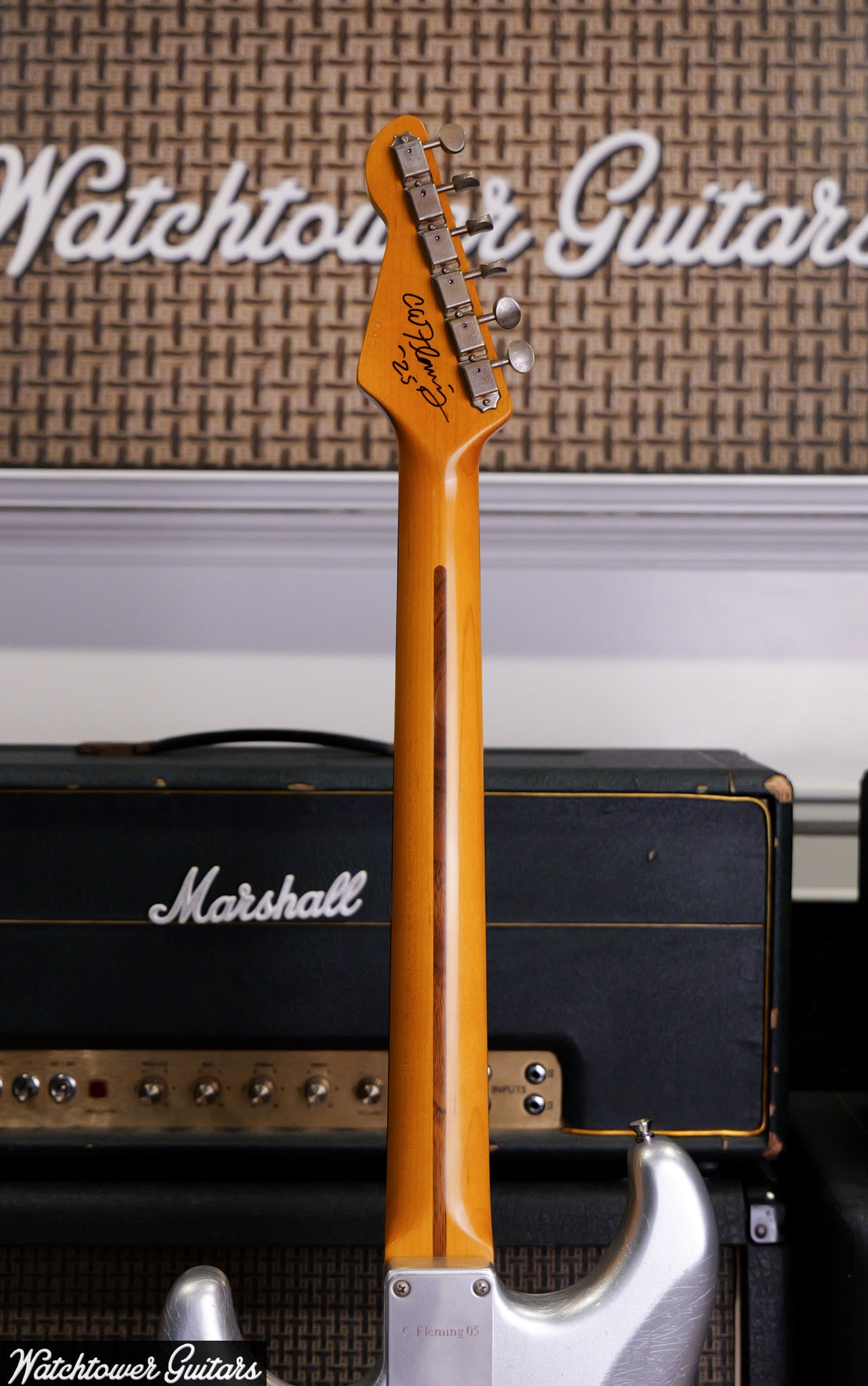 The LSL Instruments Saticoy SSS Chris Fleming Team Built in Inca Silver is a limited-production, builder-collab Strat-style instrument that blends vintage-inspired appointments with modern playability. The alder body is finished in Inca Silver with no top wood or binding, and shows light-to-medium body and hardware aging with no arm wear. Hardware is chrome with a vintage-style bridge and tuners; knobs and pickguard are mint. The neck is quartersawn maple with a gloss amber-tint finish (including headstock) and a medium C profile described as “played-in” in feel; the neck shows light-to-medium aging with a knock-back gloss and carries an engraved neck plate. Fingerboard is rosewood with a 9.5" radius and 21 6105 frets.