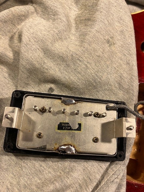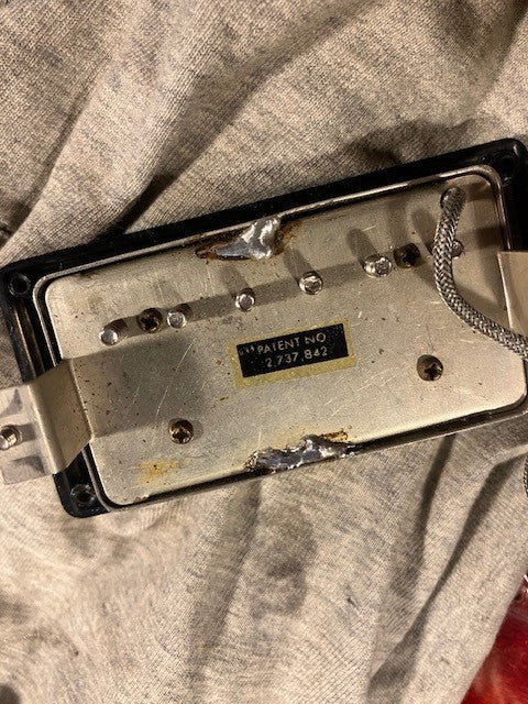 The original patent number pickups are strong and clear, measuring 8.37 neck and 7.95 bridge respectively, drive your tube amp really well! Check pics of the backs. The covers may have been off at one time (our guess is late 70s/early 80s, when that was a thing), but have been professionally and neatly reinstalled.