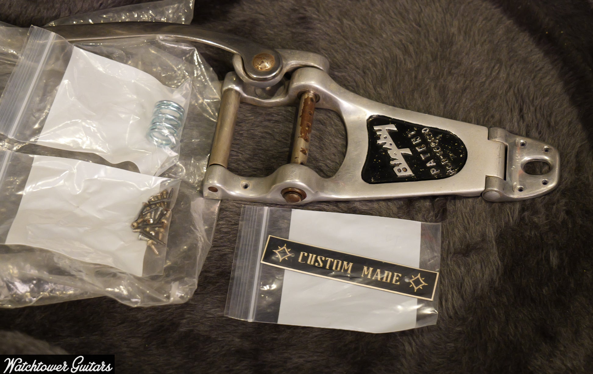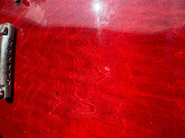 The guitar originally sported a Bigsby with a "Custom Made" plaque (both included with the guitar) affixed over where the studs for tailpiece would go. As with nearly all from this era (especially post Clapton/Cream Albert Hall), a conversion to stop tailpiece was done and all related Bigsby holes were doweled (see pics). The tailpiece is a Faber Unplated Aluminum TP-'59 Stop Tailpiece, which really sounds great. The original nylon saddled bridge remains intact