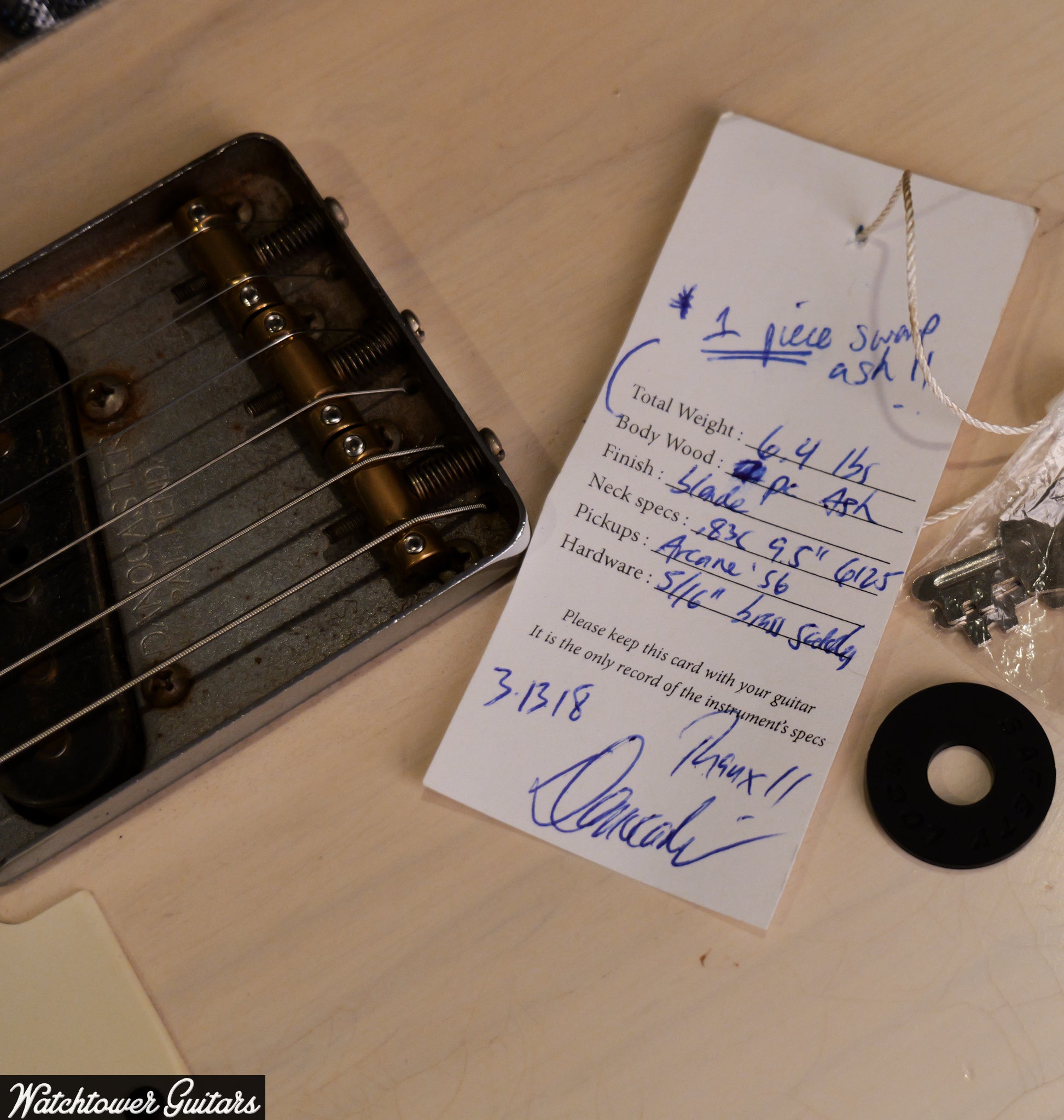 This example ships in a gig bag and includes the original hang tag.  Key specs: 2018 Danocaster Single Cut, Blonde finish, .83C neck carve, Arcane '56-spec pickups, rare 1-piece ash body, approx. 6.4 lb weight, ships with gig bag and hang tag.