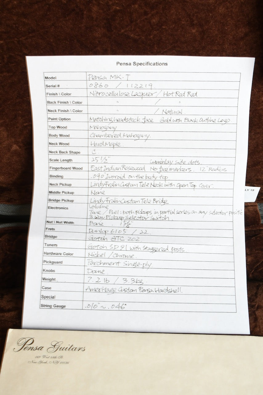 2019 Pensa MK-T Hot Rod Red Lindy Fralin Custom Tele Pickups $4,495.00