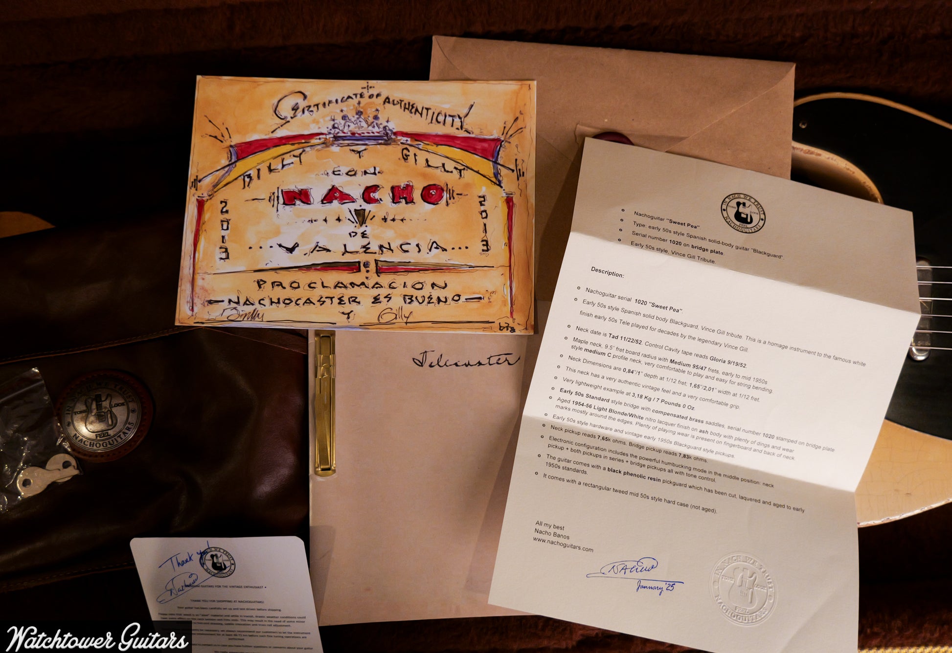 This 2025 Nacho Telecaster "Sweet Pea" #1020 in Aged Light Blonde with a white/black guard is a hand-aged tribute to Vince Gill’s 1950s Blackguard Telecasters, built with period-correct appointments and modern playability. It features a medium C neck profile, a traditional single-cut ash body (or alder if specified by builder — confirm if you need exact wood), vintage-style bridge and saddles, and authentic-looking aging on the finish and hardware that reproduces the feel of a well-played '50s instrument. At a super-light 7.0 lbs, the guitar offers lively, resonant tone and comfortable balance for extended playing.