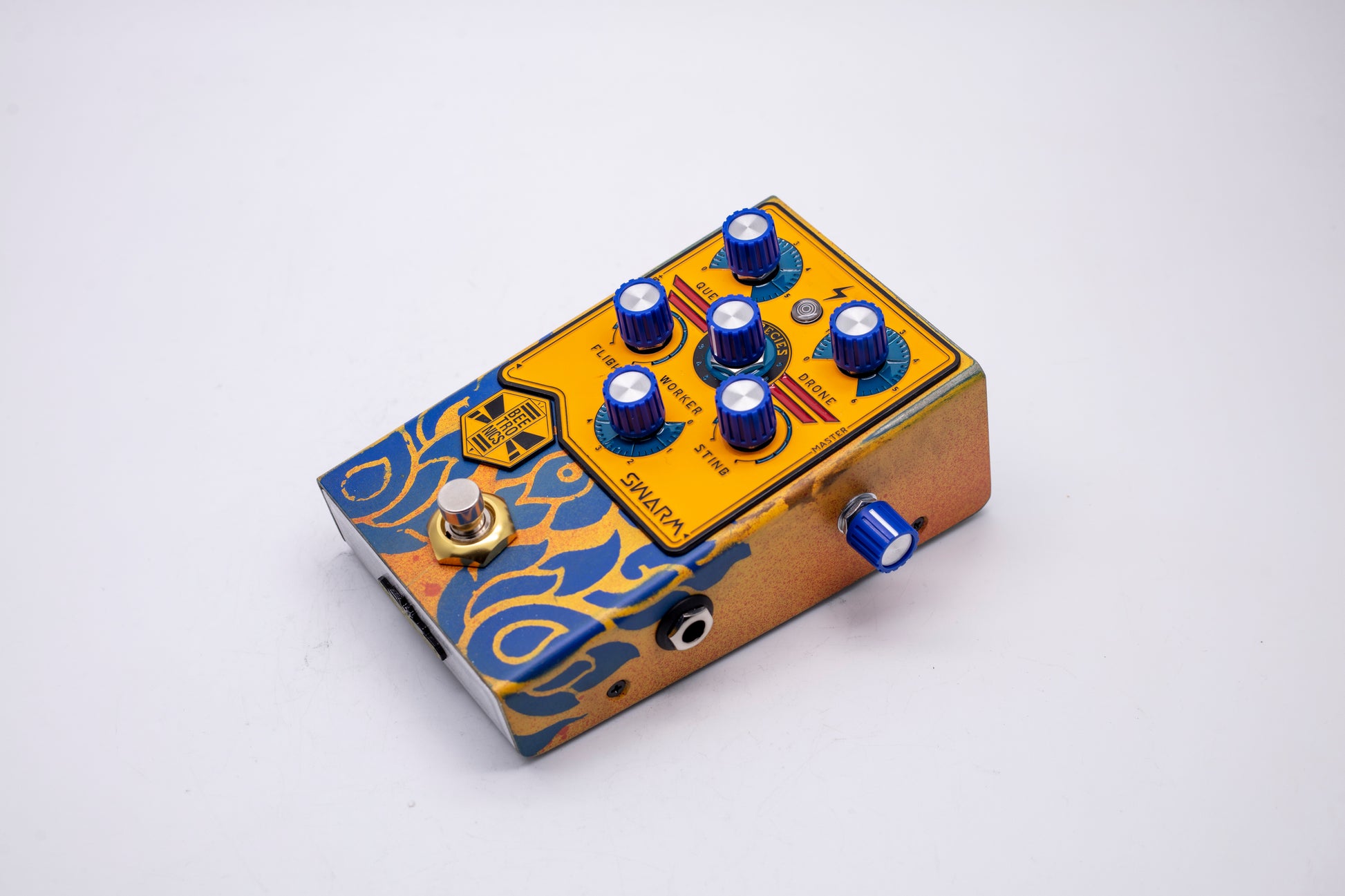 The WORKER sets the level of your input signal, now fuzzy and buzzy. The SPECIES allows you to select between 9 different intervals for your harmonies. The QUEEN and DRONE set the levels for each of the harmonies that stay one octave apart.