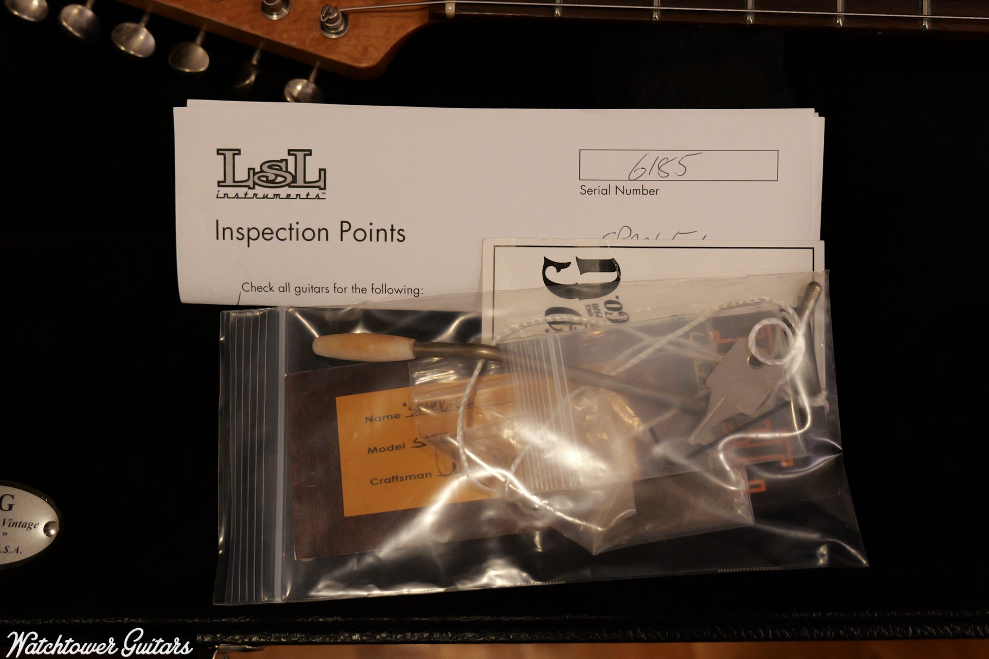 Electrically, the Saticoy Classic S Spark-E is equipped with three single-coil pickups in a VTT 5-way configuration, all in parchment color to match the vintage vibe. This setup offers versatile tonal options suitable for a wide range of musical styles. Vintage-style tuners, a vintage bridge, and parchment knobs complete the hardware ensemble. The guitar ships in a G&G hard case, providing secure protection. This custom build from LSL Instruments is a well-balanced blend of visual appeal, playability, and tonal flexibility.