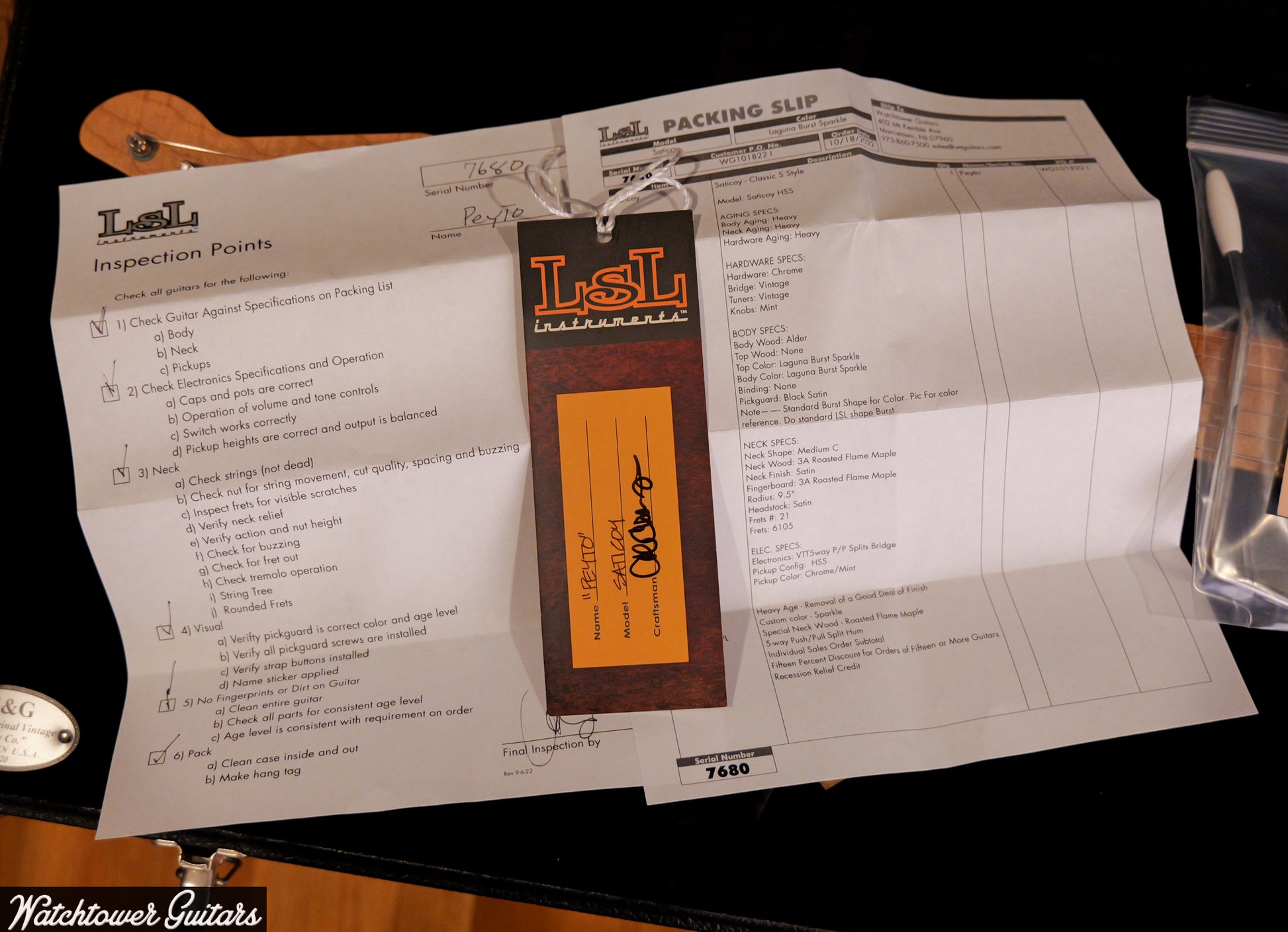 The 2024 LSL Instruments Saticoy in Laguna Burst Sparkle is a classic S-style guitar built with an alder body and a heavy aged finish throughout—body, neck, and hardware show pronounced wear for a lived-in look. Recently traded back in so we included our original demo video. The finish is a custom Laguna Burst Sparkle (standard LSL burst shape) over no top wood, paired with a black satin pickguard and no binding. Hardware is chrome with vintage-style bridge and tuners, mint control knobs, and the instrument weighs 7 lbs 3 oz. The three-piece roasted flame maple neck is finished satin on the headstock and neck, carved in a Medium C profile with a 9.5" radius fingerboard, 21 6105 frets, and heavy neck aging consistent with the body.