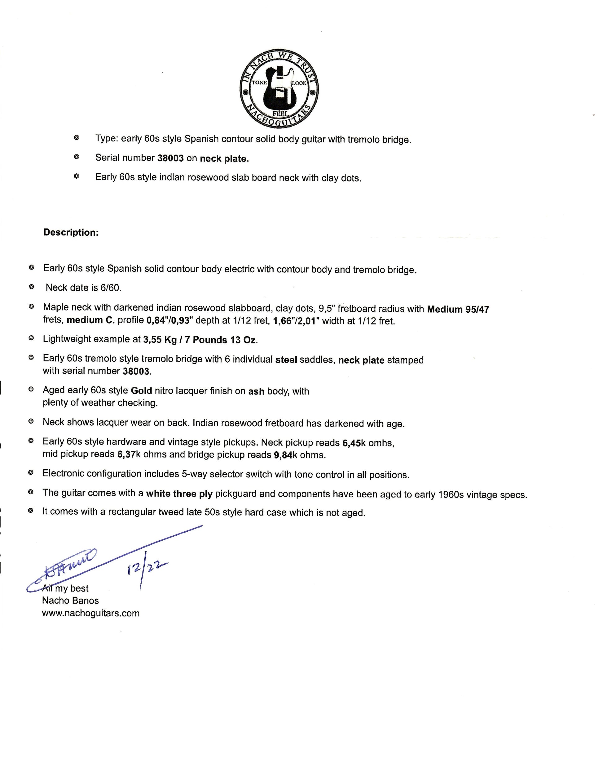- Crafted by Nacho Banos, vintage Fender style guitar specialist