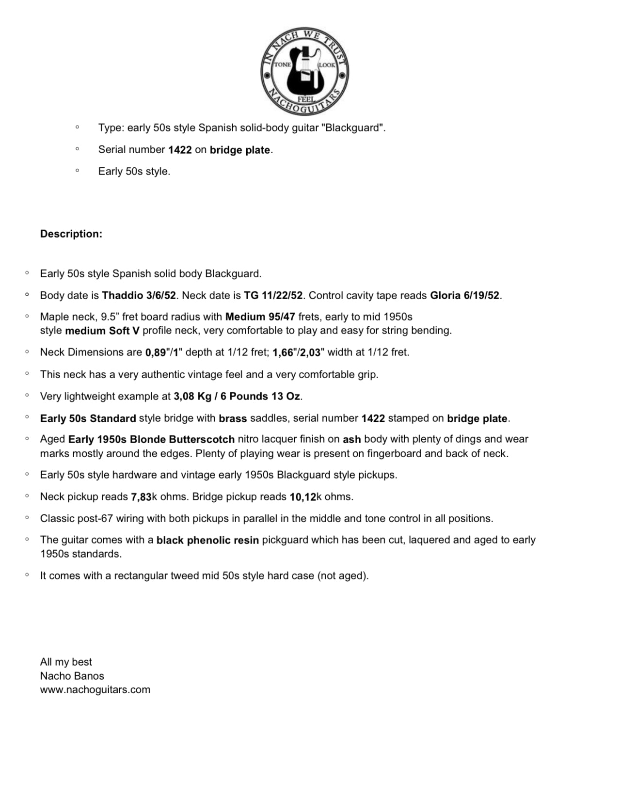 SNot only is Nacho Banos a recognized (and published) authority of early vintage Fender style guitars, and an absolute master builder with an amazing eye and skill for aging them - he is genuinely one of the nicest and most intelligent people in the guitar industry.