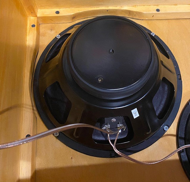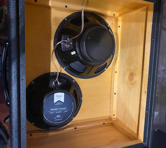 Just in from being on the road with an extremely popular Nashville based artist. This amp fills the room like no other. A mix of vintage JTM45 and '57 Bassman circuits. Very versatile, check out the video. This one has 6L6 power tubes, although it will accept many other style tubes with updated biasing. The cab has two Eminence speakers, a 12" Texas Heat and a 10" Ragin Cajun. She's got some wear and tear which is shown in the detailed pics.