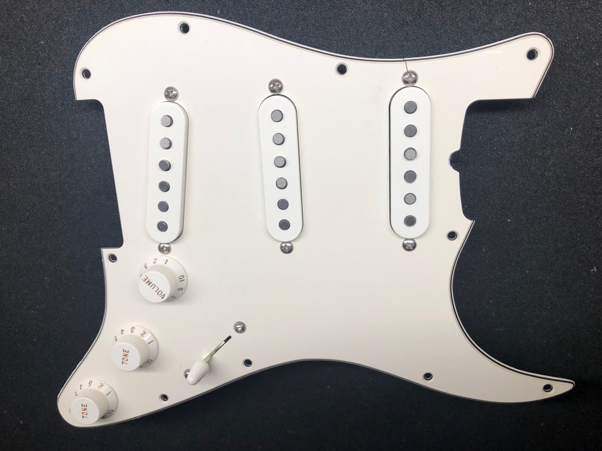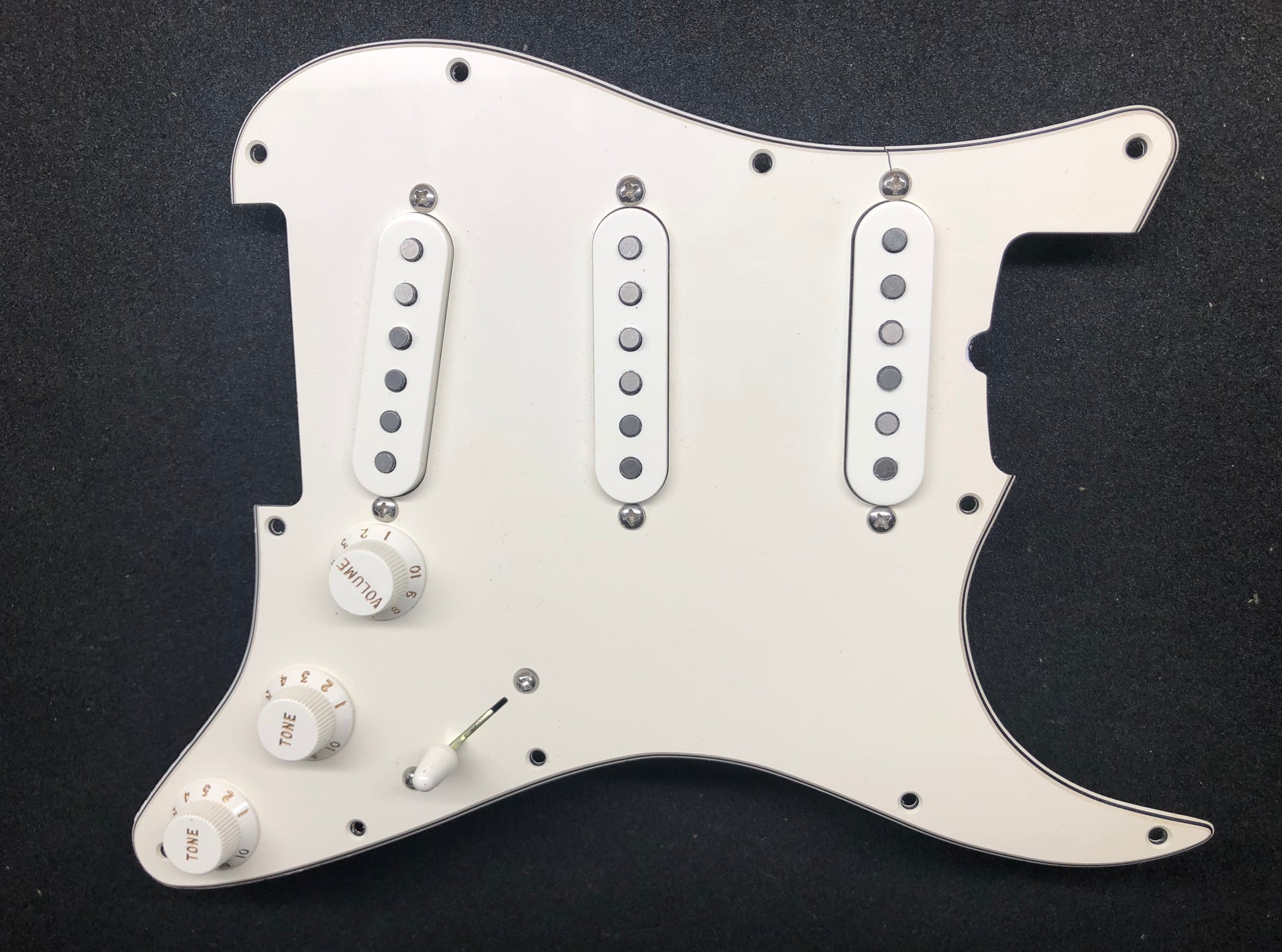 Mounted to a Strat pick guard that has a bit of wear (and a crack) with parchment covers And knobs. New CTS pots, new Oak Grigsby 5-way switch and an excellent SPRAGUE 0.1 uf 1000V NOS vitamin Q type paper in oil capacitor.